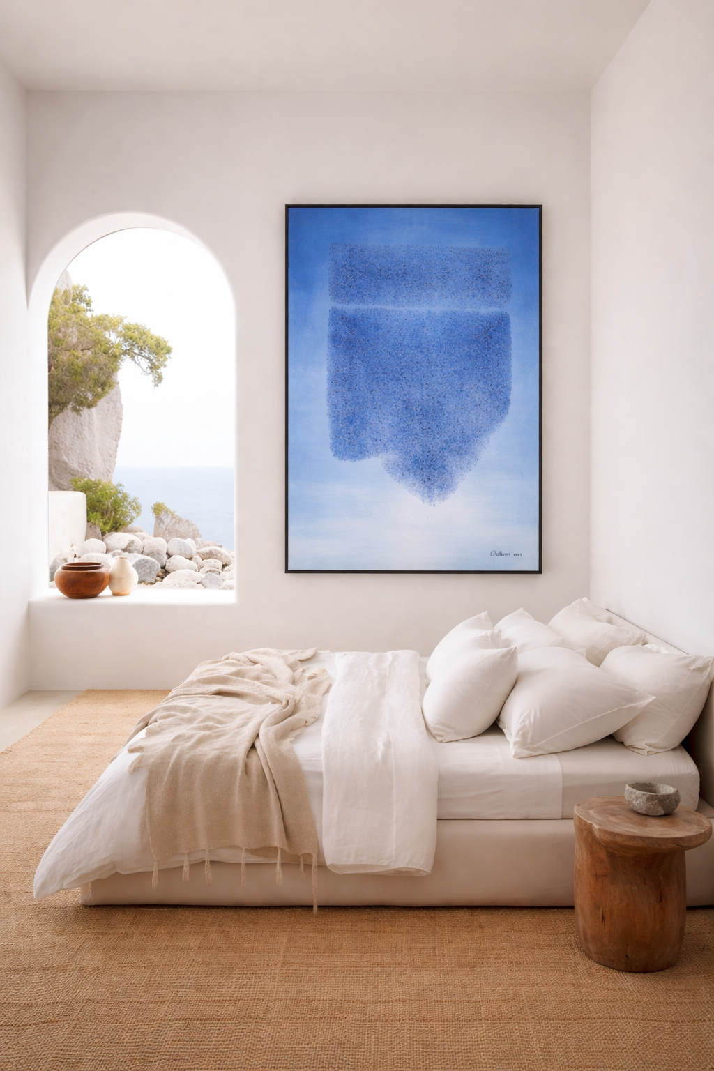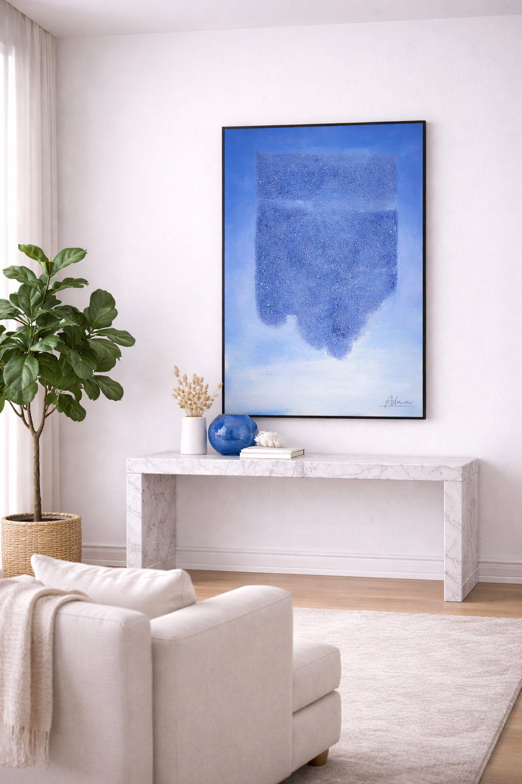 This coastal horizon wall art suits modern, minimalist, Japandi, and coastal-inspired interiors. It works beautifully above sofas, sideboards, dining consoles, or beds. In addition, it enhances elegant office spaces and reception areas. The neutral palette, paired with a confident blue accent, complements beige, cream, grey, marble, and natural wood finishes effortlessly.