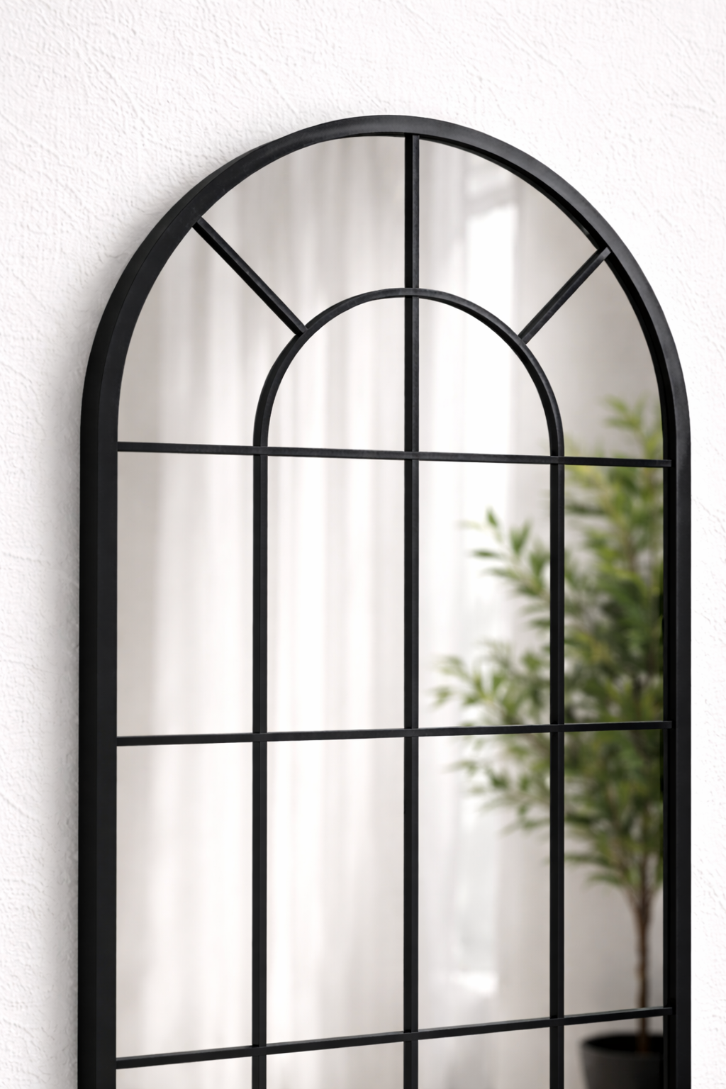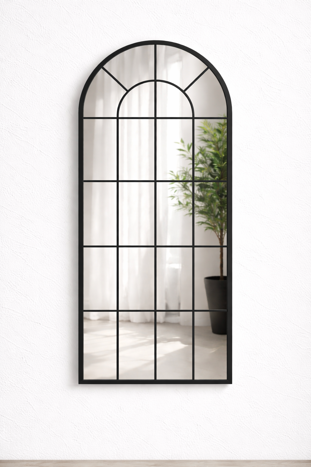 An elegant arched black wall mirror with a window-style grid design. Sized at 100 × 180 cm, it adds light, height, and architectural character to modern interiors.