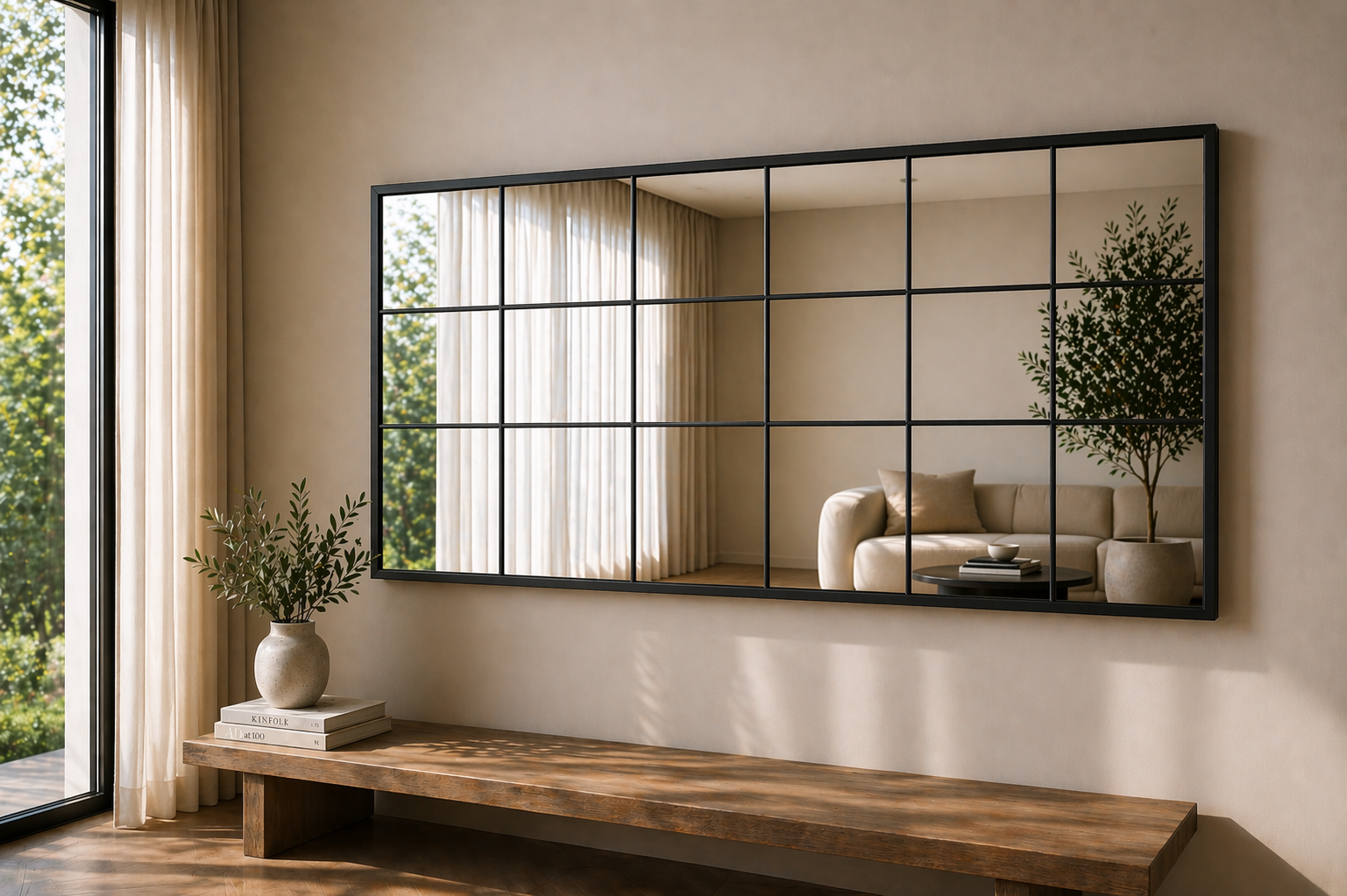 The black grid frame adds depth and contrast, making this mirror ideal for modern, minimalist, and industrial interiors. It enhances light reflection while acting as a strong visual feature.