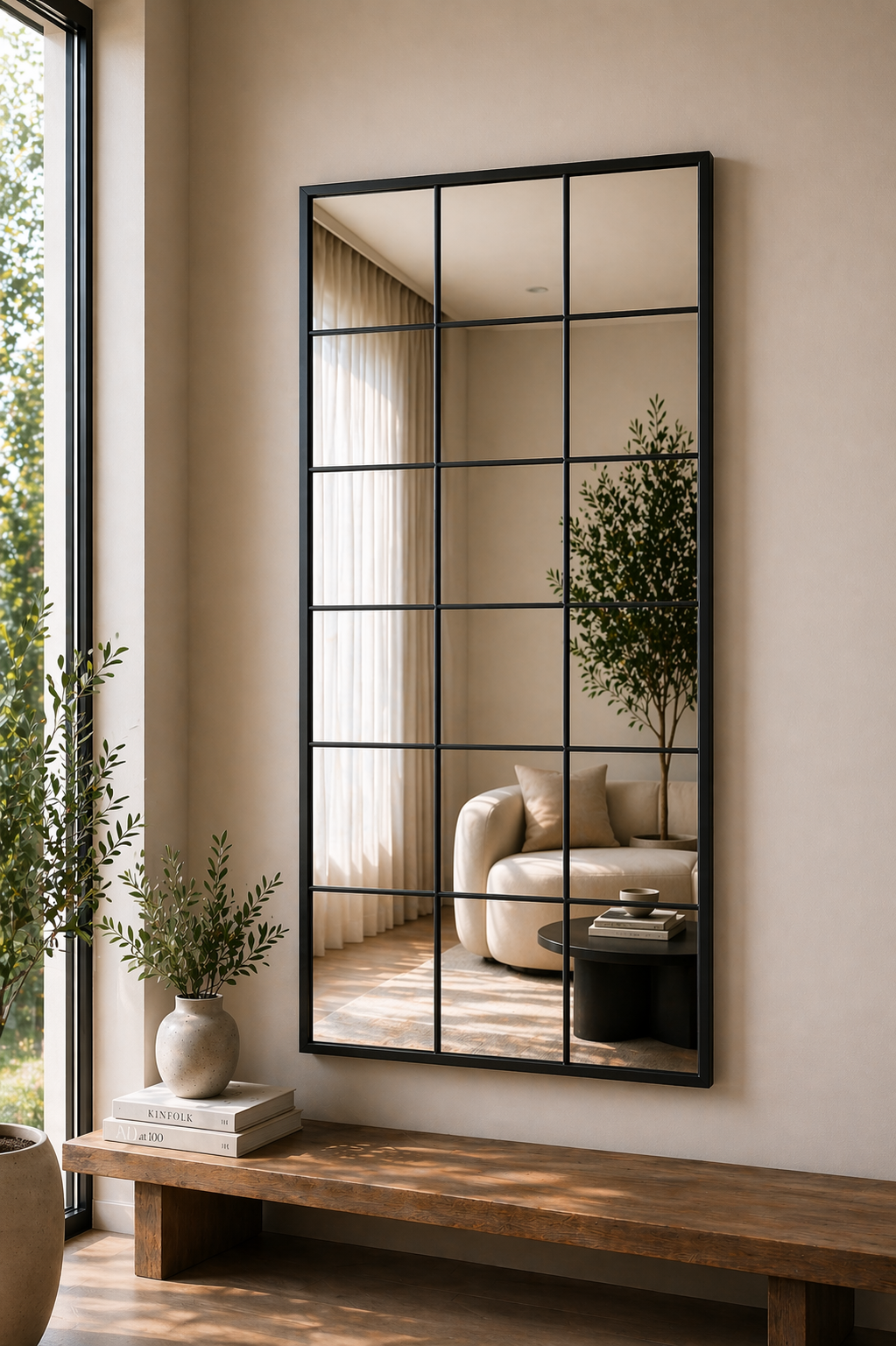 Black full length grid mirror UAE is designed to bring structure and elegance into modern interiors. The rectangular shape combined with a window-style grid frame creates a bold architectural look that enhances any space.