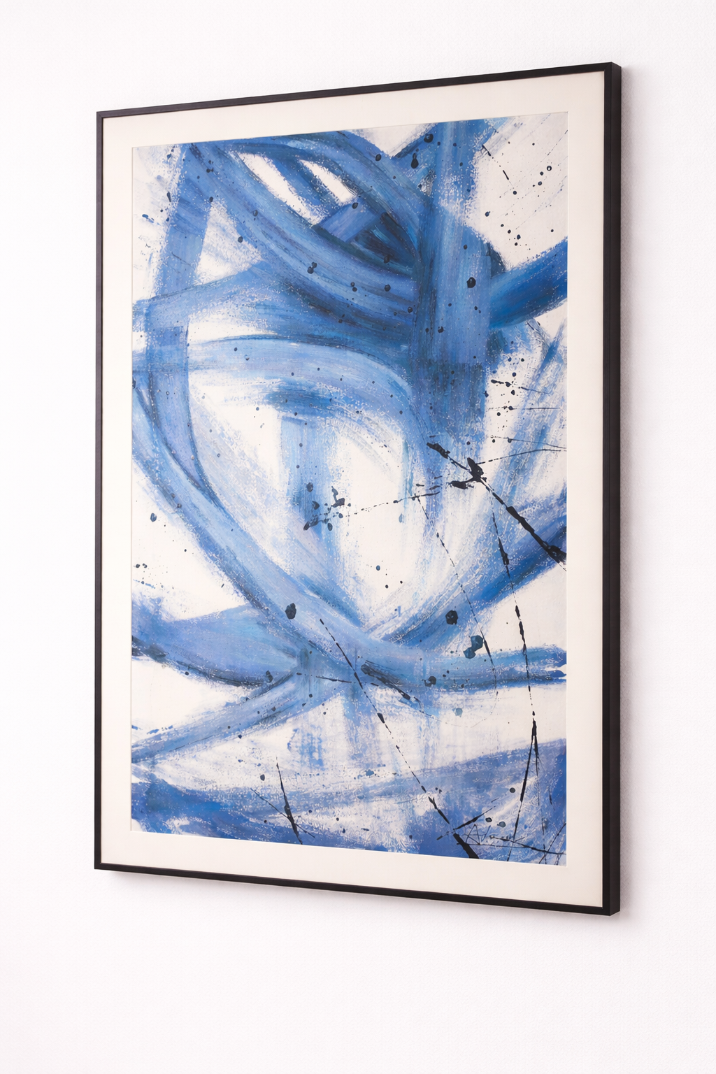 A hand painted blue abstract wall art featuring intersecting brush strokes and dynamic movement, perfect for modern and expressive interiors.