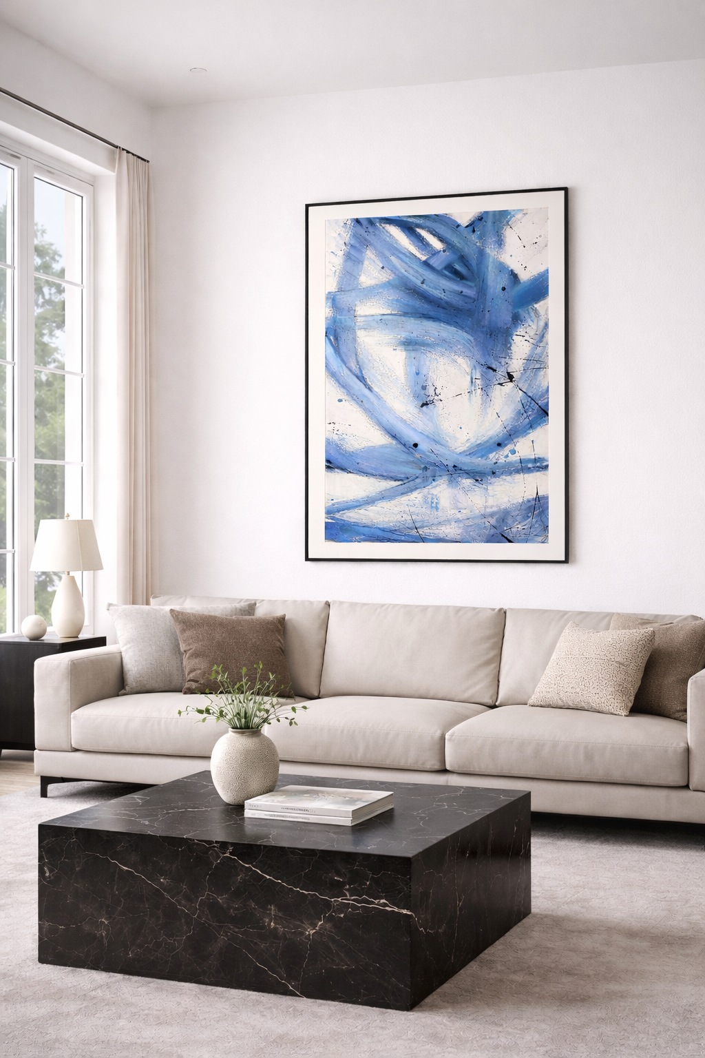 This blue abstract wall art is ideal for modern, contemporary, and artistic interiors. It works beautifully in living rooms, creative workspaces, hallways, and statement walls. Moreover, it pairs effortlessly with white, beige, grey, concrete textures, and black accents, making it suitable for both residential and professional spaces.