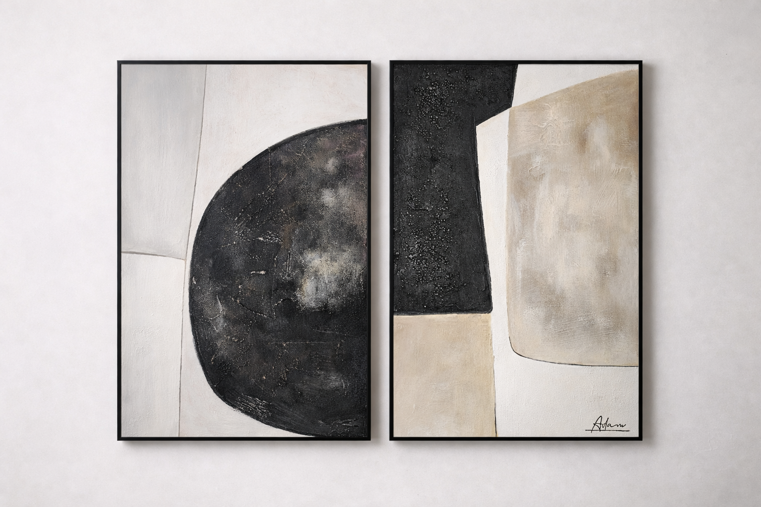 Commanding and enigmatic, Obsidian Eclipse is a striking statement piece defined by a dramatic black curvature over soft ivory tones. The interplay between the heavy texture and soft shadowing creates a quiet yet powerful visual rhythm — a balance of mystery and sophistication.