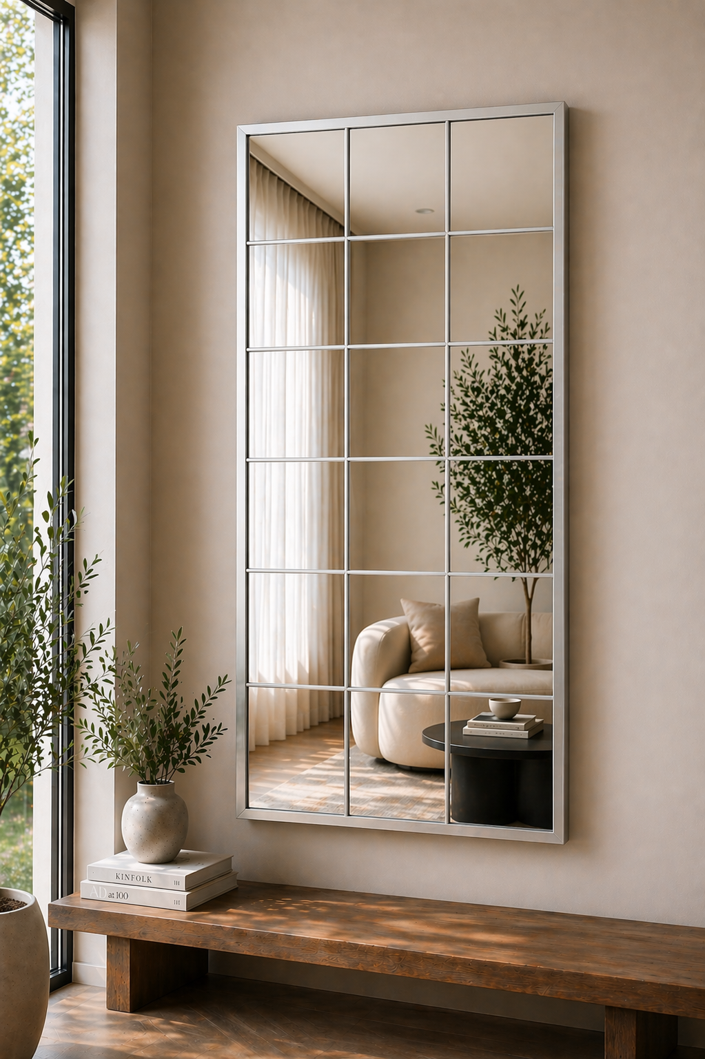 Silver full length grid mirror UAE is designed to bring brightness and modern elegance into your space. The rectangular shape combined with a window-style grid frame enhances depth and creates a clean architectural look.
